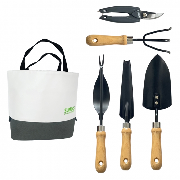 Included Tools | Trowel w/Wood Handle 320mm Dandelion Trowel w/Wood Handle 333mm Cultivator w/Wood Handle 250mm Weeder w/Lever w/Wood Handle 340mm By-pass Pruner 197mm Drawstring Bag (30 × 32 × 8 cm) |