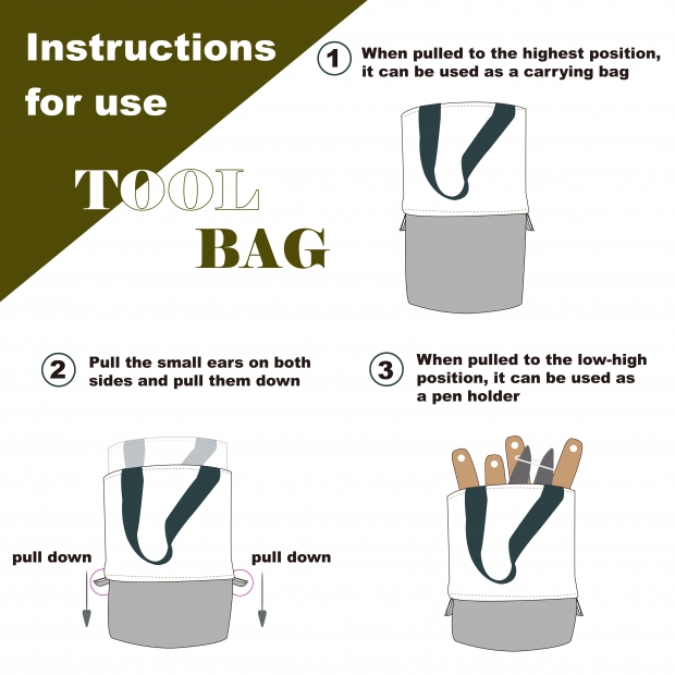 - Unique Tool Bag – Two-section extension design saves space; pull down as tool holder, pull up for storage or carrying.